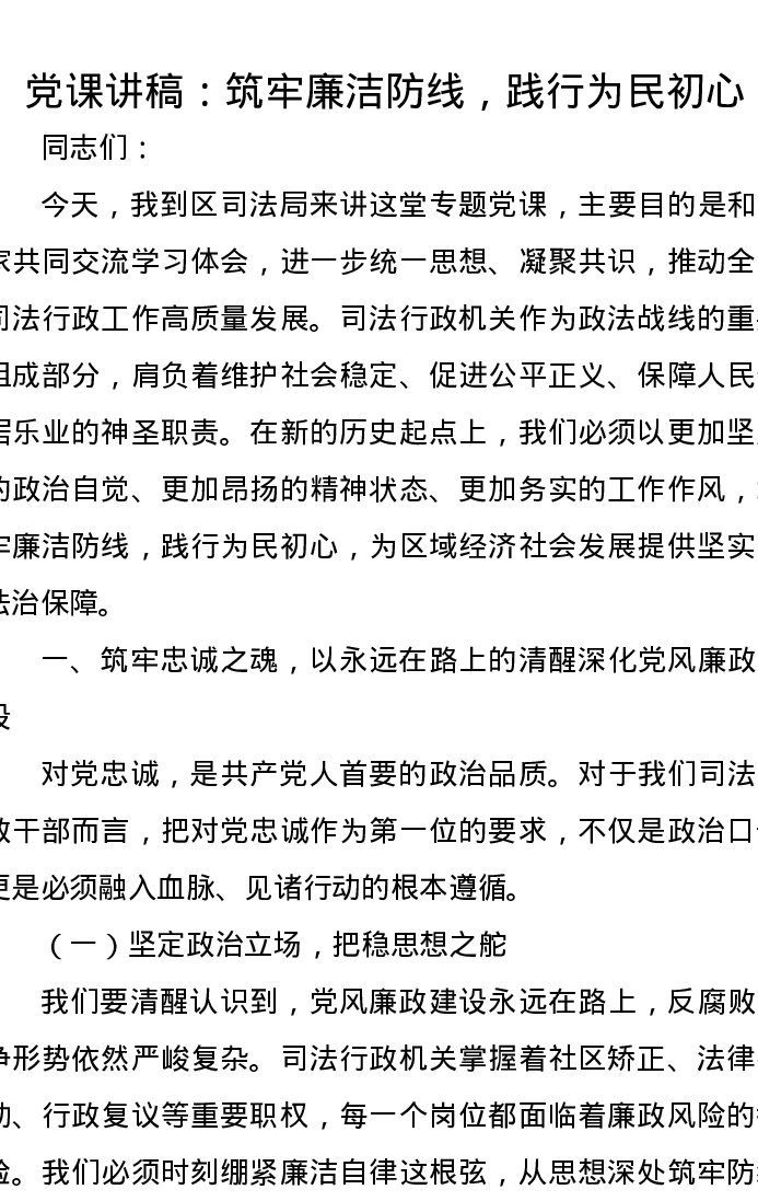 党课讲稿:筑牢廉洁防线,践行为民初心
