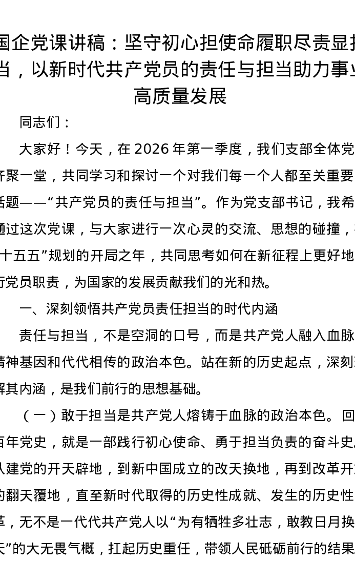 国企党课讲稿:坚守初心担使命履职尽责显担当,以新时代共产党员的责任与担当助力事业高质量发展