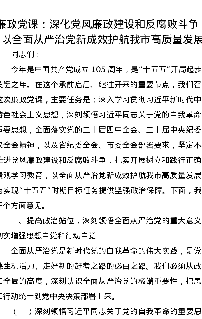 廉政党课:深化党风廉政建设和反腐败斗争,以全面从严治党新成效护航我市高质量发展