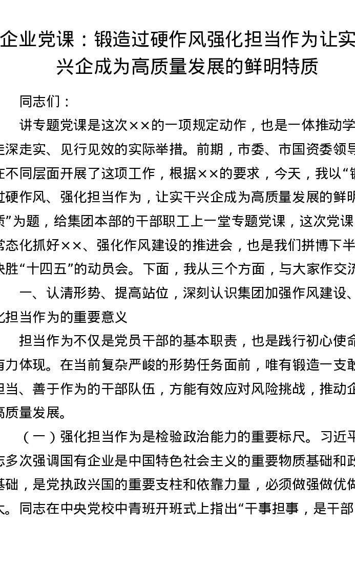企业党课:锻造过硬作风 强化担当作 为让实干兴企成为高质量发展的鲜明特质