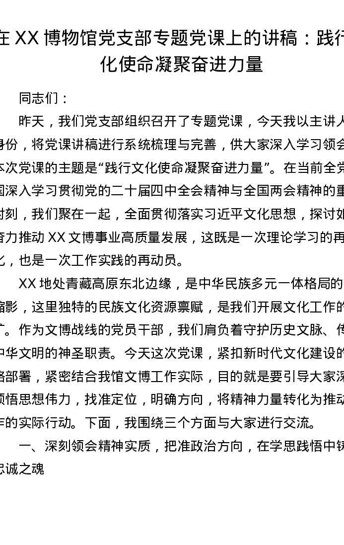在XX博物馆党支部专题党课上的讲稿:践行文化使命 凝聚奋进力量