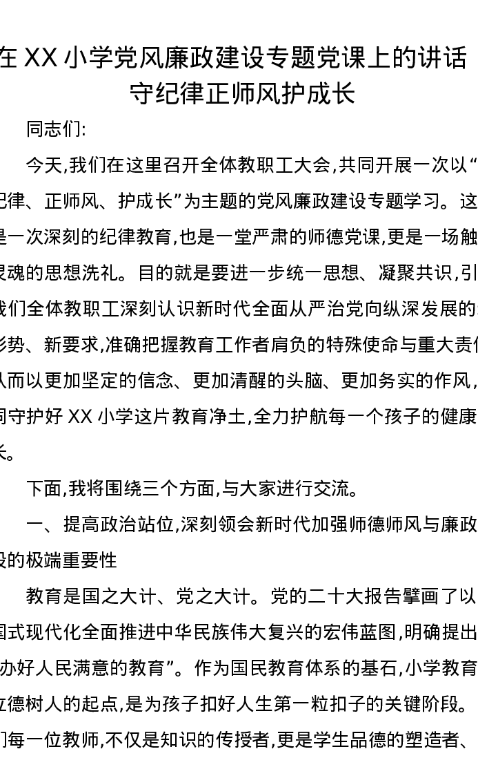 在XX小学党风廉政建设专题党课上的讲话:守纪律正师风护成长