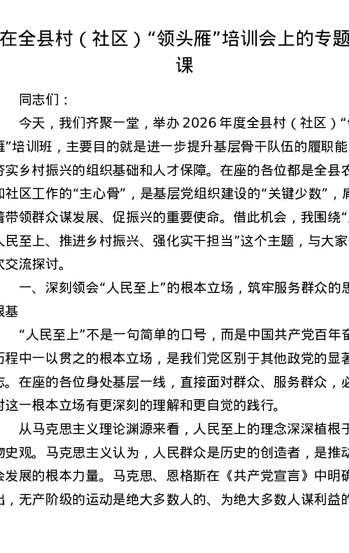 在全县村(社区)领头雁 培训会上的专题党课