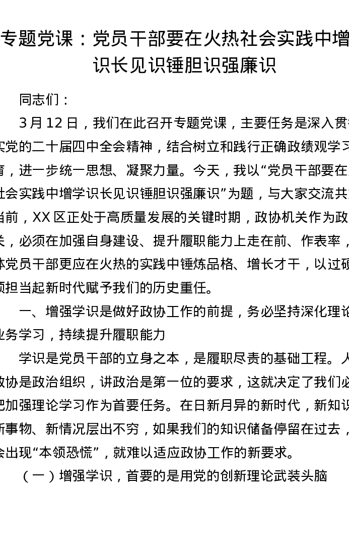 专题党课:党员干部要在火热社会实践中增学识长见识锤胆识强廉识