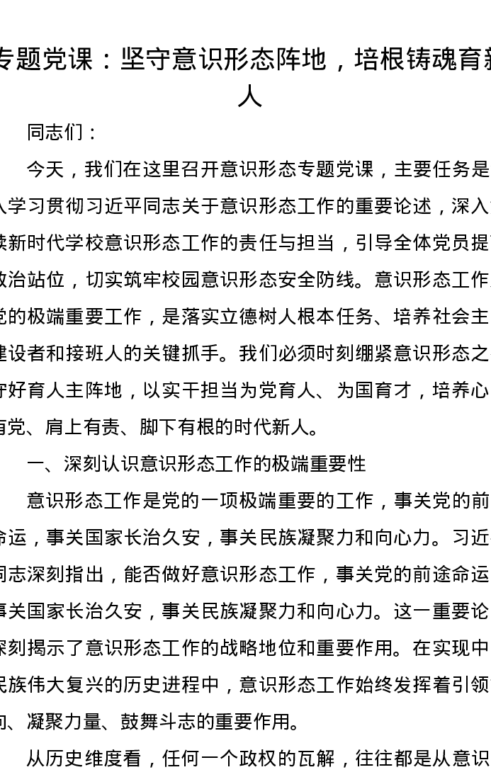 专题党课:坚守意识形态阵地,培根铸魂育新人