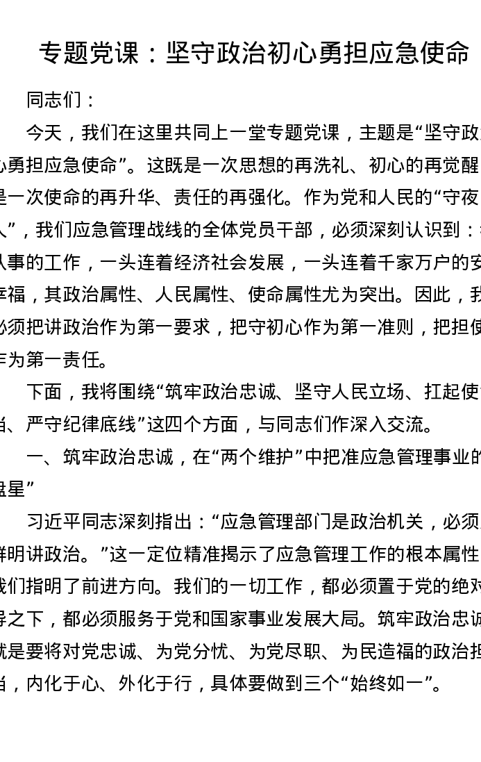 专题党课:坚守政治初心 勇担应急使命