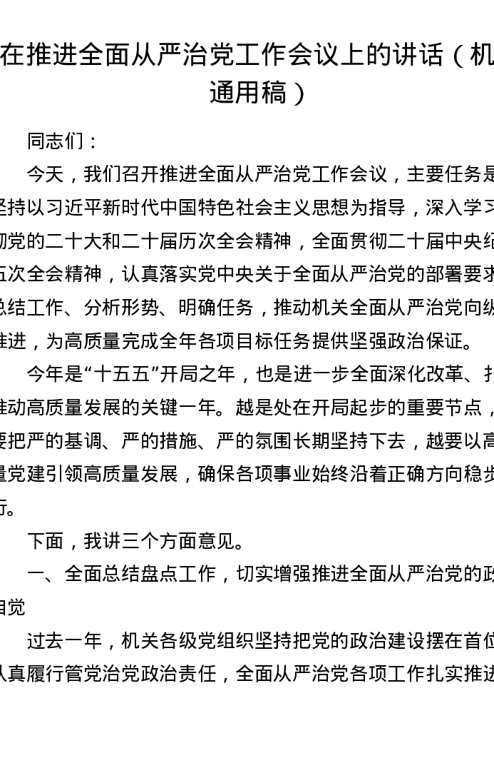 (通用)在推进全面从严治党工作会议上的讲话