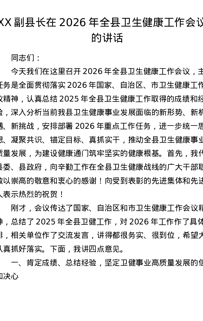 XX副县长在2026年全县卫生健康工作会议上的讲话