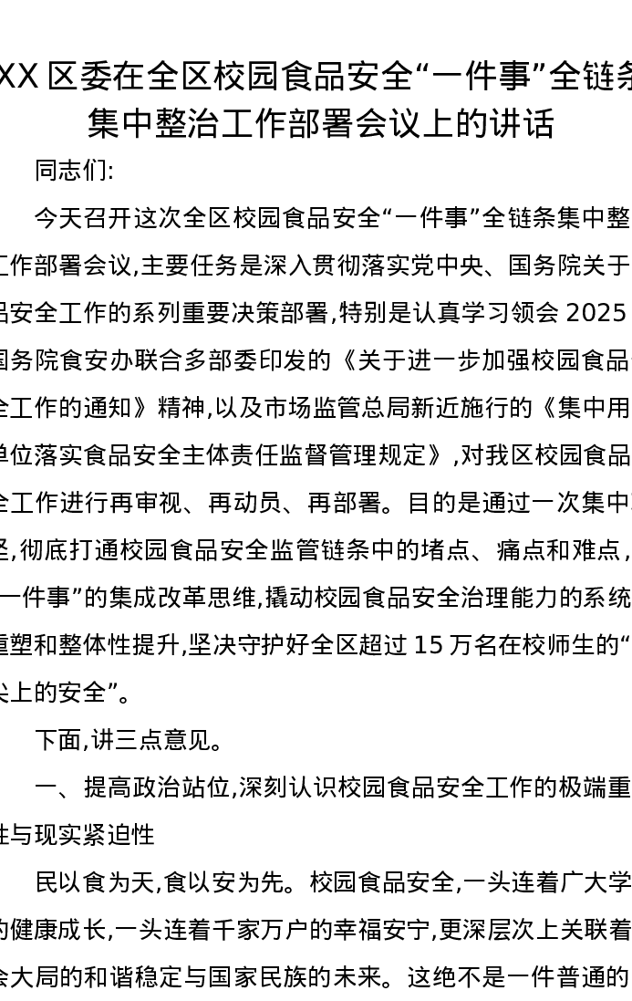 XX区委在全区校园食品安全一件事全链条集中整治工作部署会议上的讲话