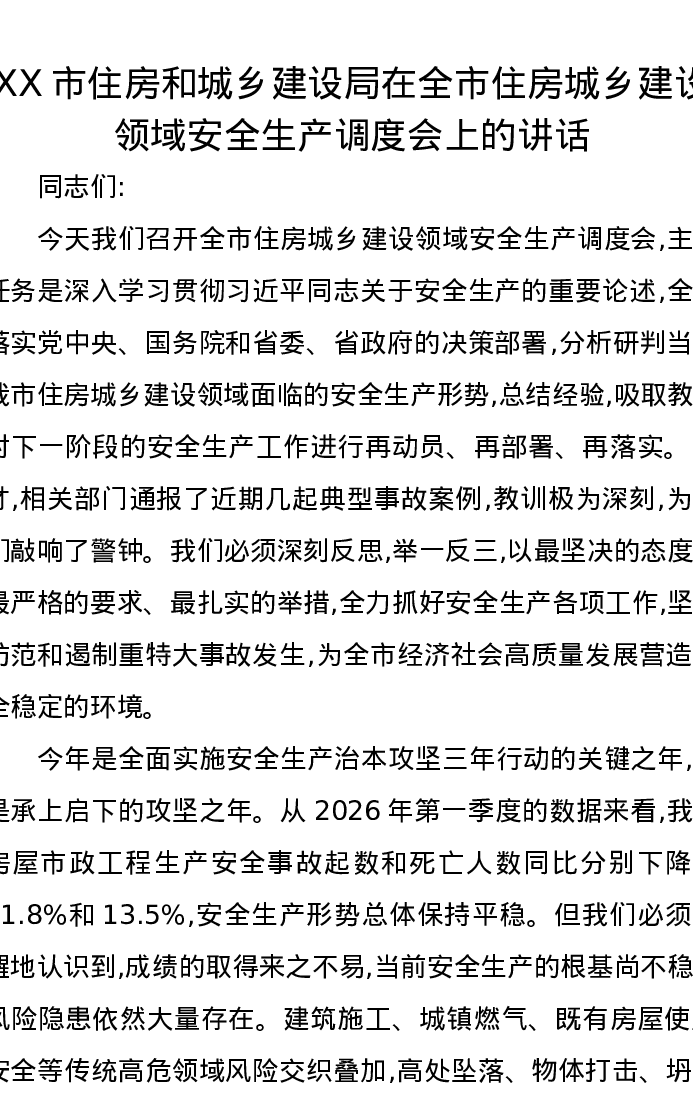 XX市住房和城乡建设局在全市住房城乡建设领域安全生产调度会上的讲话