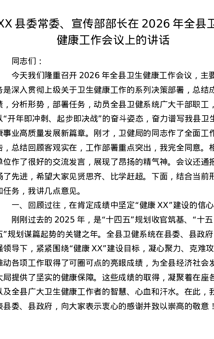 XX县委常委、宣传部部长在2026年全县卫生健康工作会议上的讲话