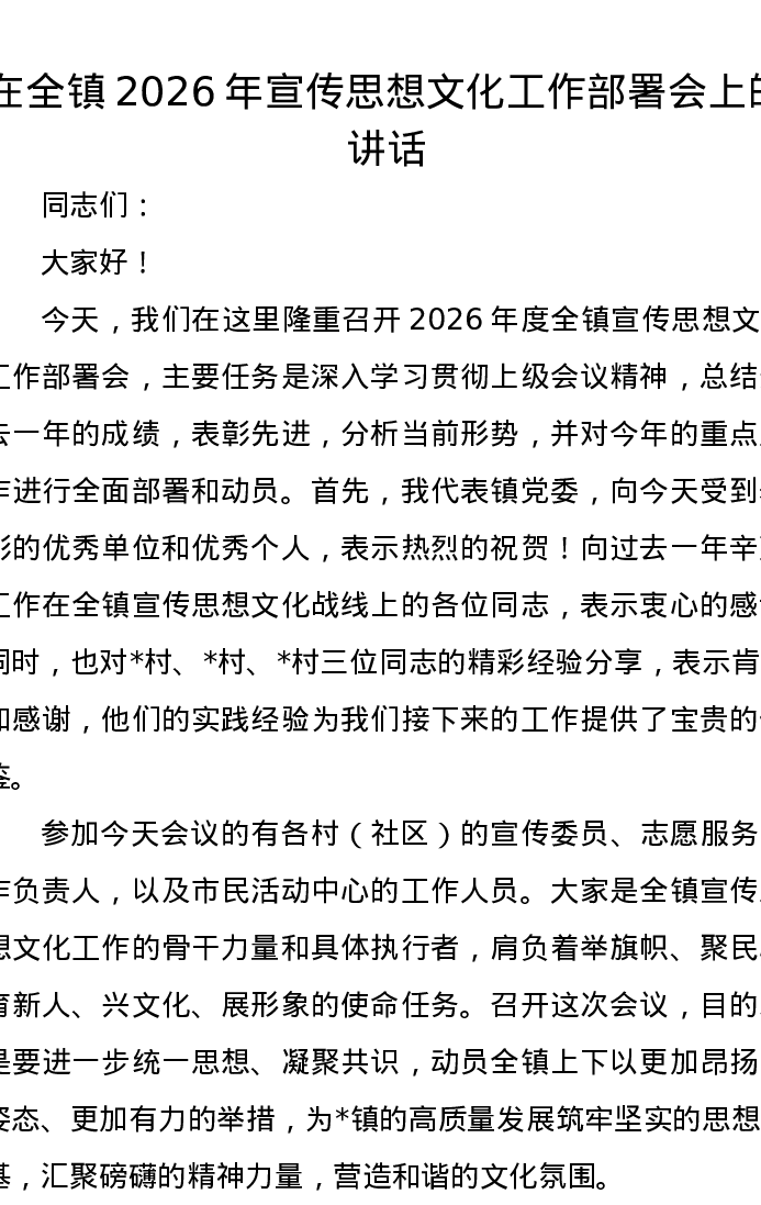在全镇2026年宣传思想文化工作部署会上的讲话