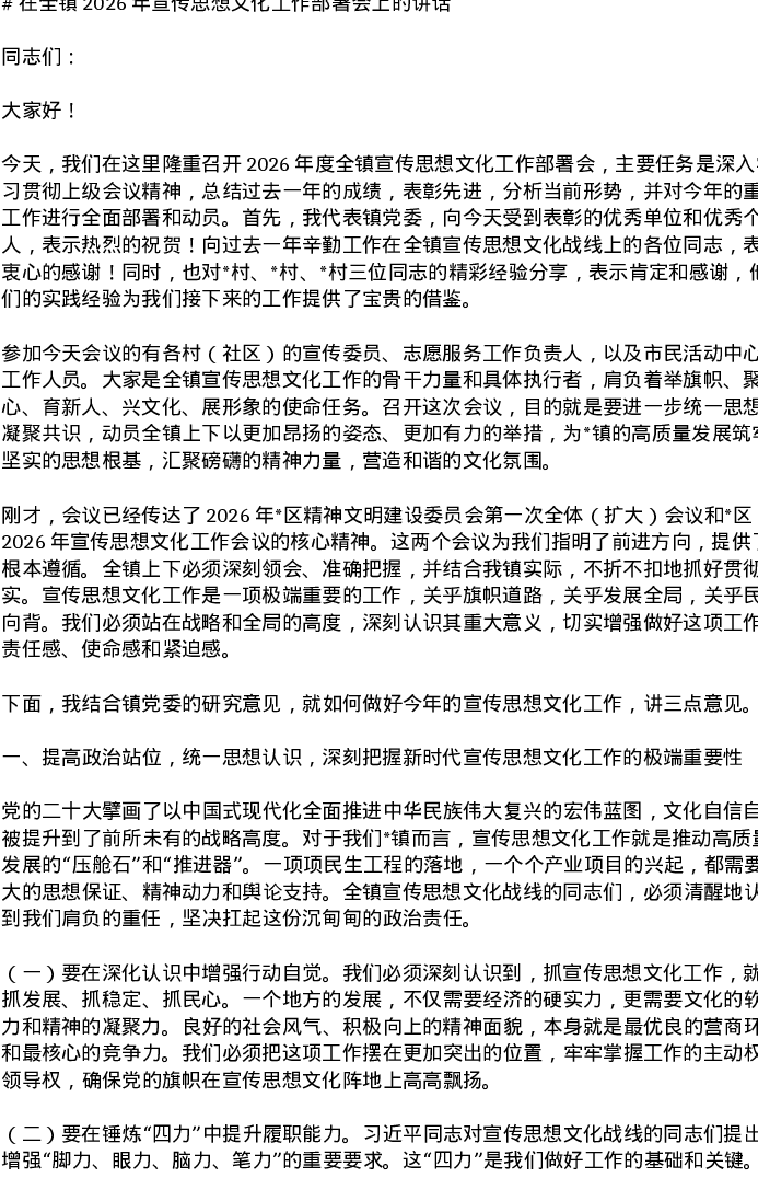 在全镇2026年宣传思想文化工作部署会上的讲话