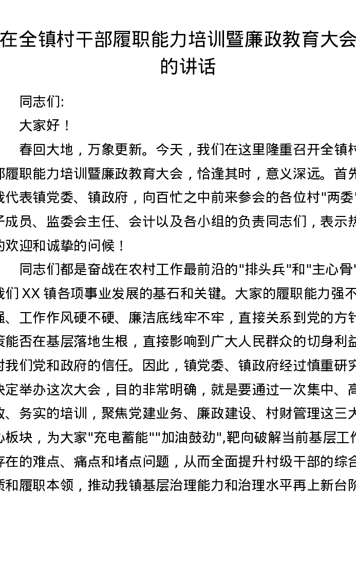 在全镇村干部履职能力培训暨廉政教育大会上的讲话