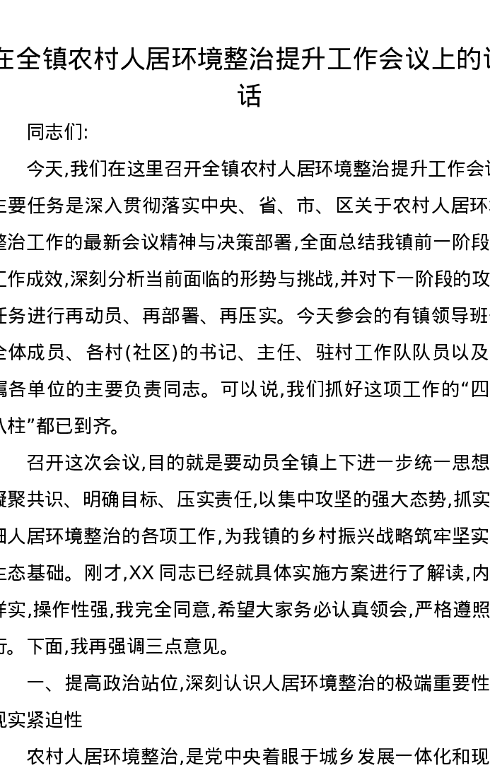 在全镇农村人居环境整治提升工作会议上的讲话