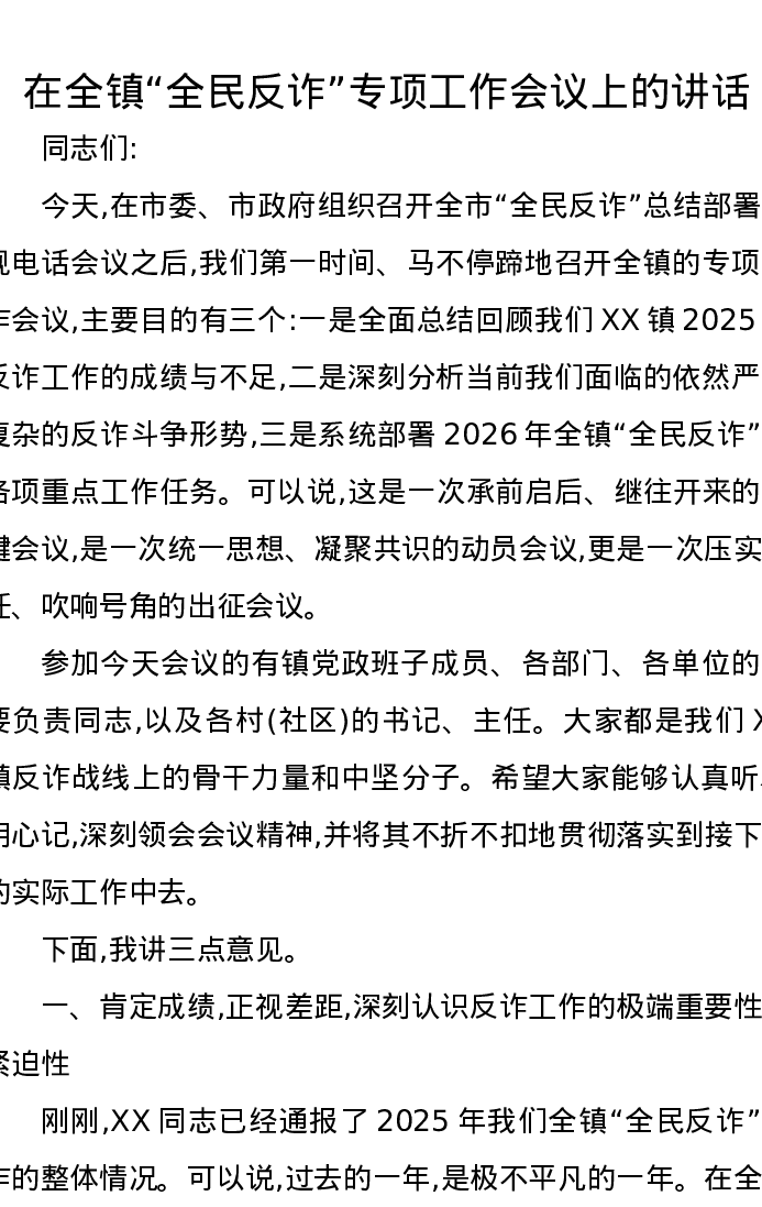 在全镇全民反诈专项工作会议上的讲话