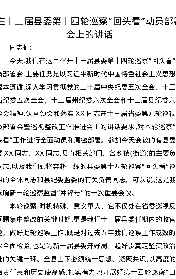 在十三届县委第十四轮巡察回头看动员部署会上的讲话