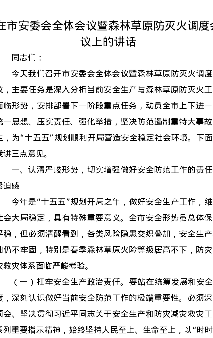 在市安委会全体会议暨森林草原防灭火调度会议上的讲话