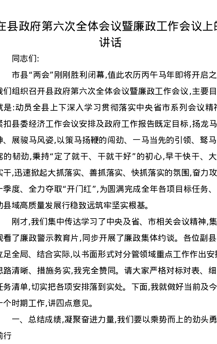 在县政府第六次全体会议暨廉政工作会议上的讲话