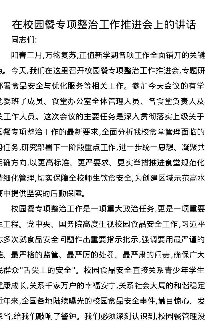 在校园餐专项整治工作推进会上的讲话