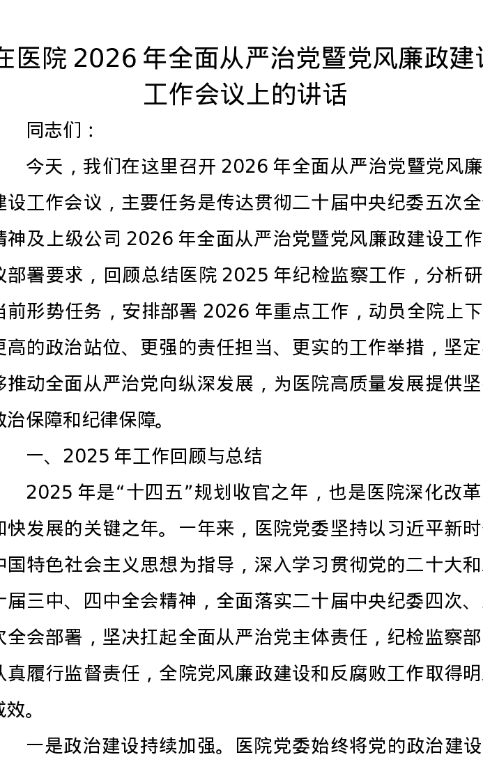 在医院2026年全面从严治党暨党风廉政建设工作会议上的讲话