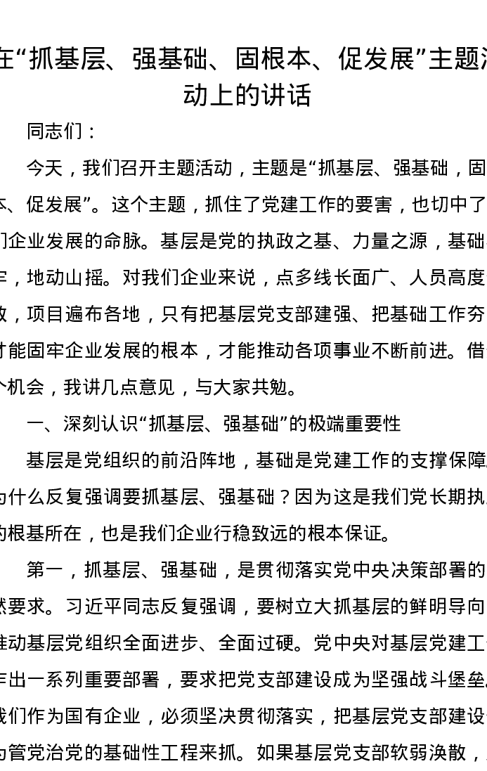 在抓基层、强基础、固根本、促发展主题活动上的讲话