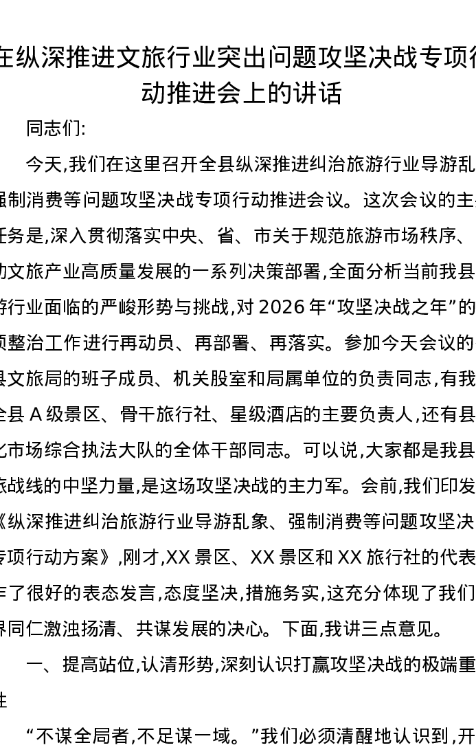在纵深推进文旅行业突出问题攻坚决战专项行动推进会上的讲话