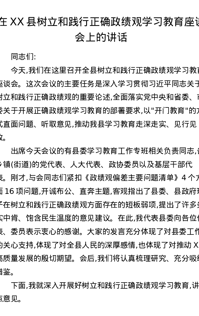 在XX县树立和践行正确政绩观学习教育座谈会上的讲话