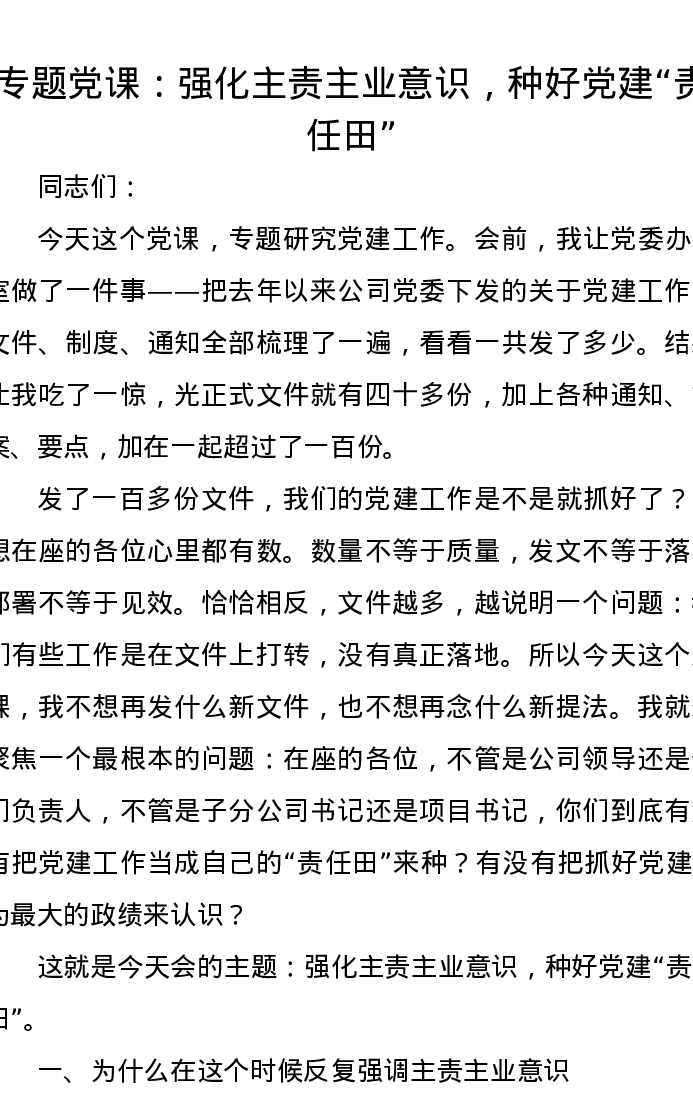 专题党课:强化主责主业意识,种好党建“责任田”