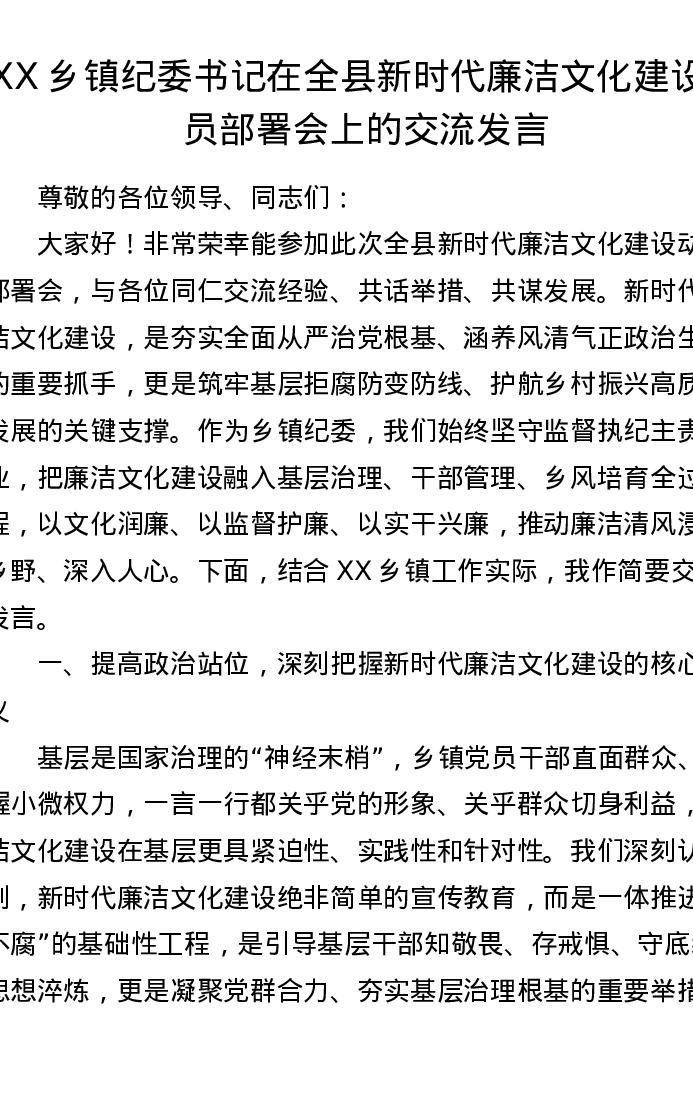XX乡镇纪委书记在全县新时代廉洁文化建设动员部署会上的交流发言