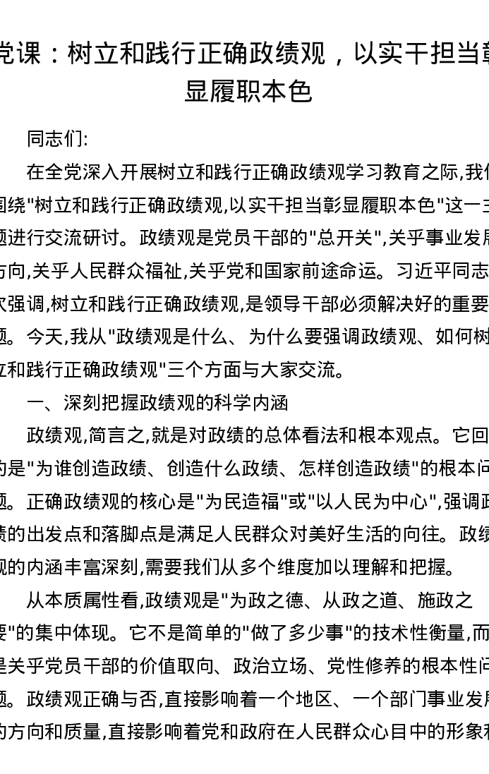 党课:树立和践行正确政绩观,以实干担当彰显履职本色