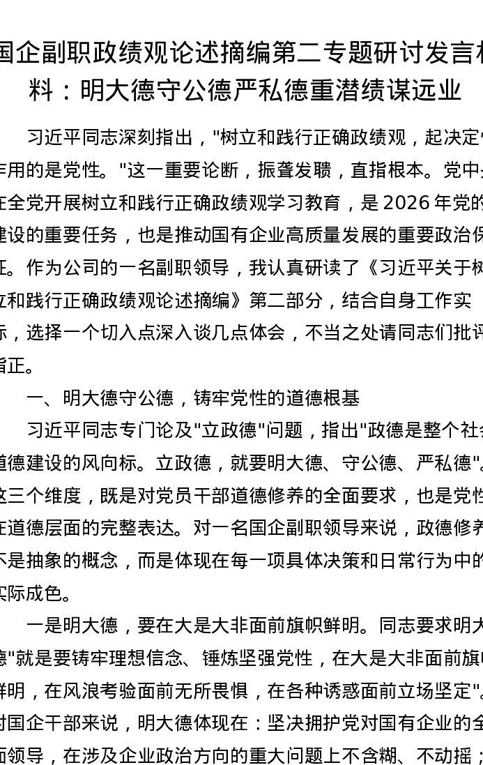 国企副职政绩观论述摘编第二专题研讨发言材料:明大德守公德严私德重潜绩谋远业