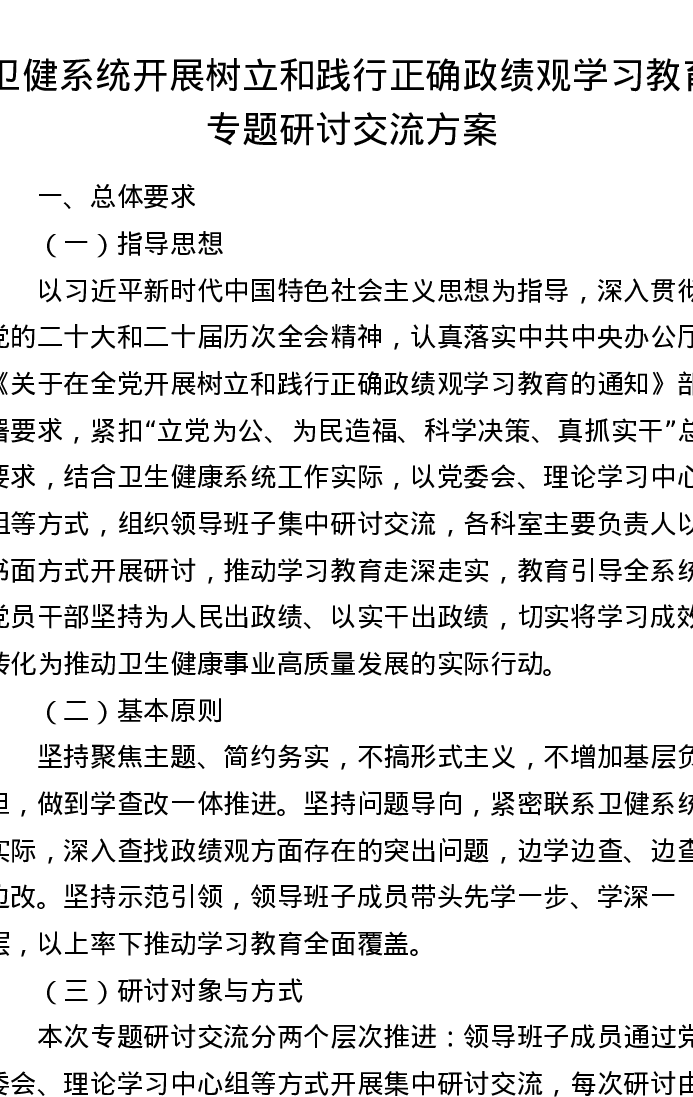 卫健系统开展树立和践行正确政绩观学习教育专题研讨交流方案