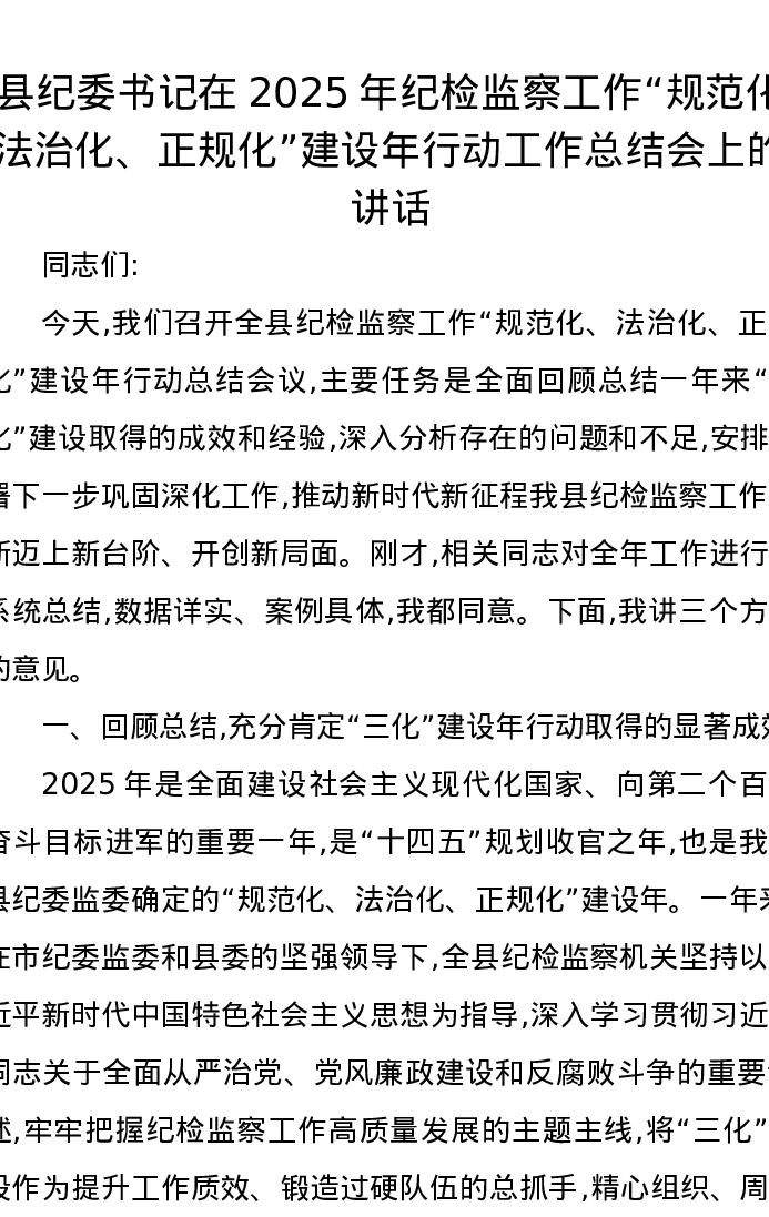县纪委书记在2025年纪检监察工作“规范化、法治化、正规化”建设年行动工作总结会上的讲话