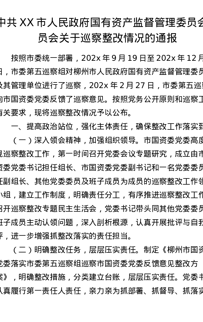 中共XX市人民政府国有资产监督管理委员会委员会关于巡察整改情况的通报