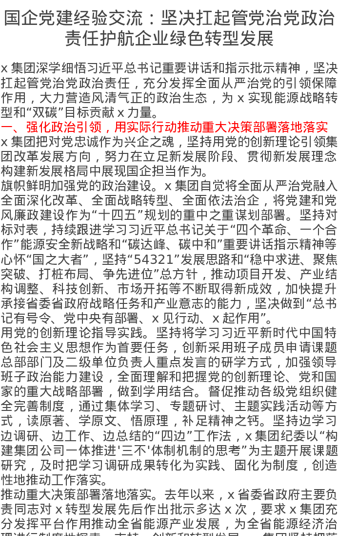 国企党建经验交流:坚决扛起管党治党政治责任护航企业绿色转型发展