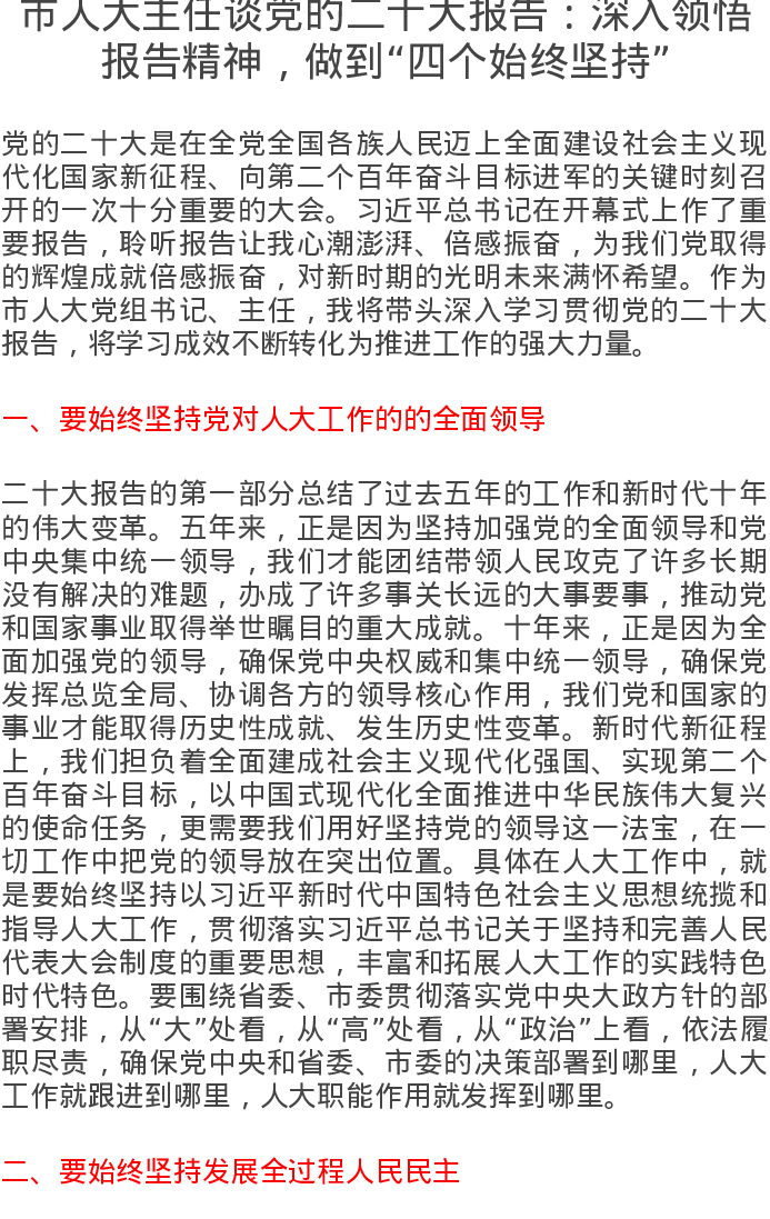 市人大主任谈党的二十大报告:深入领悟报告精神,做到“四个始终坚持”