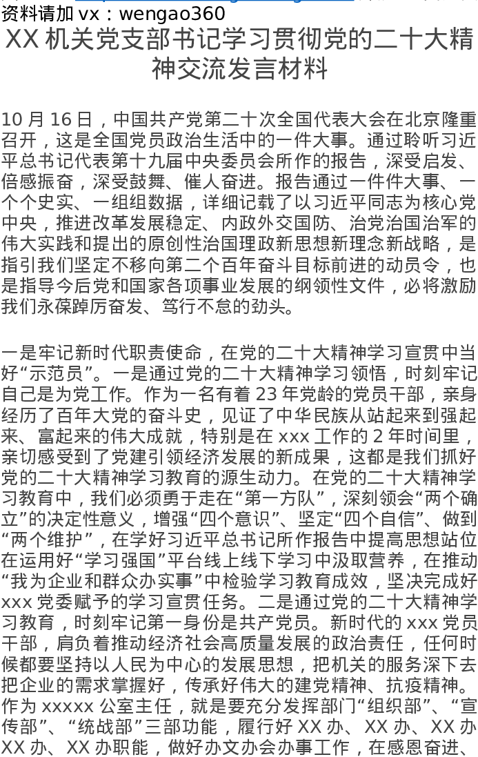 XX机关党支部书记学习贯彻党的二十大精神交流发言材料