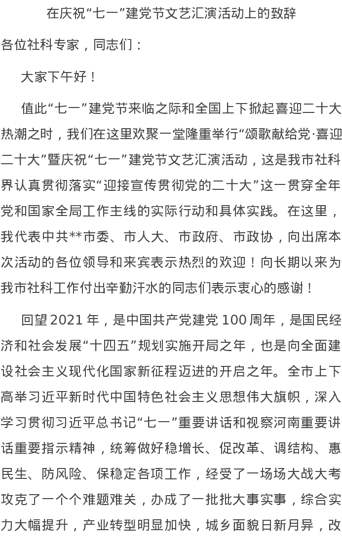 03-20220623在庆祝“七一”建党节文艺汇演活动上的致辞