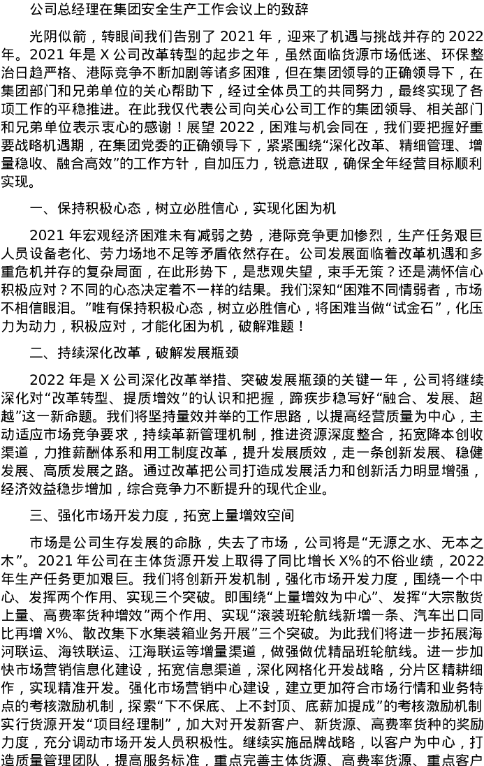 20220103公司总经理在集团安全生产工作会议上的致辞