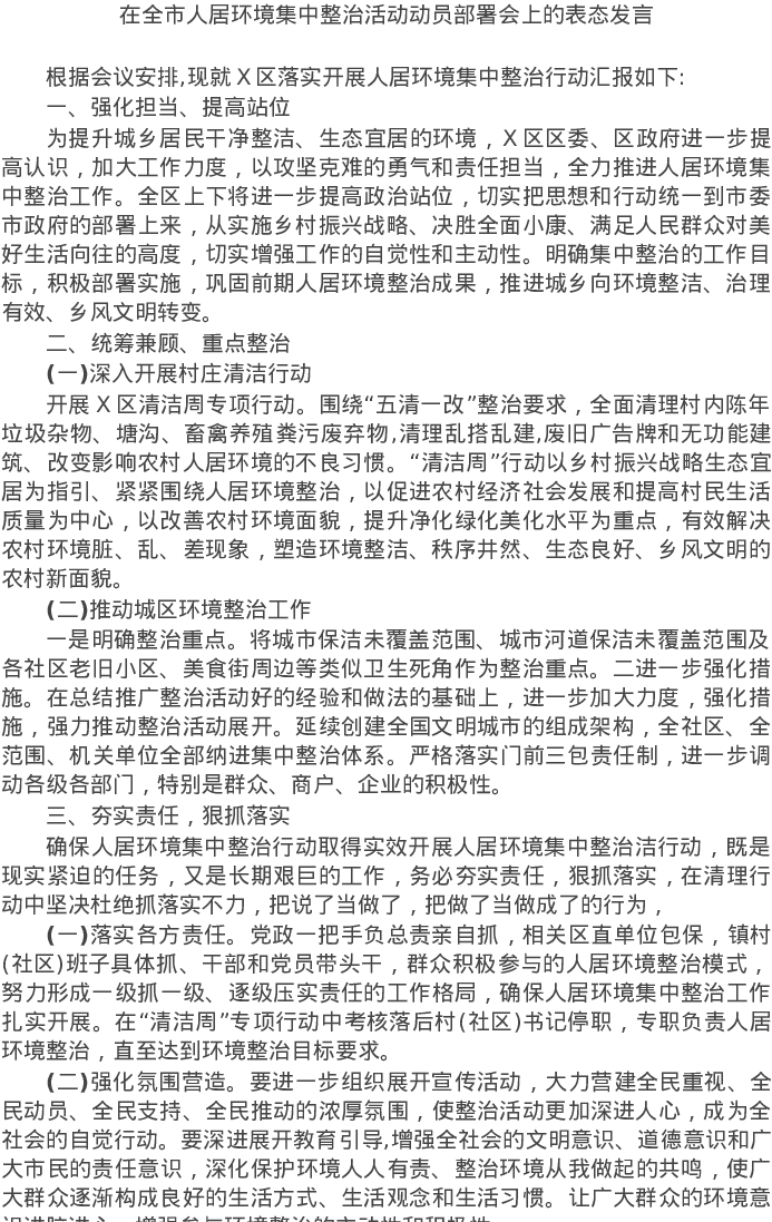 20220207在全市人居环境集中整治活动动员部署会上的表态发言