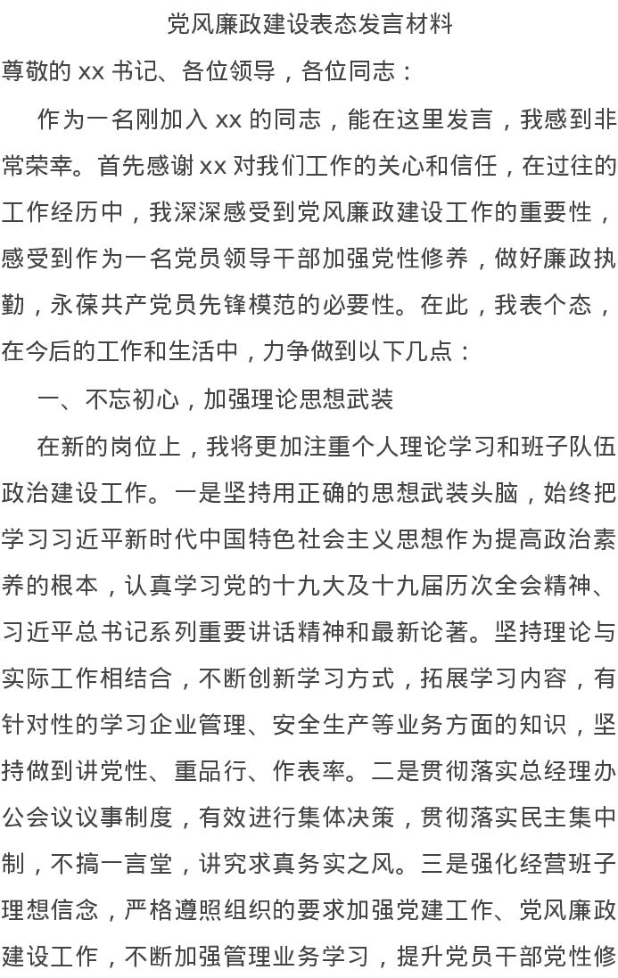20220210党风廉政建设表态发言材料