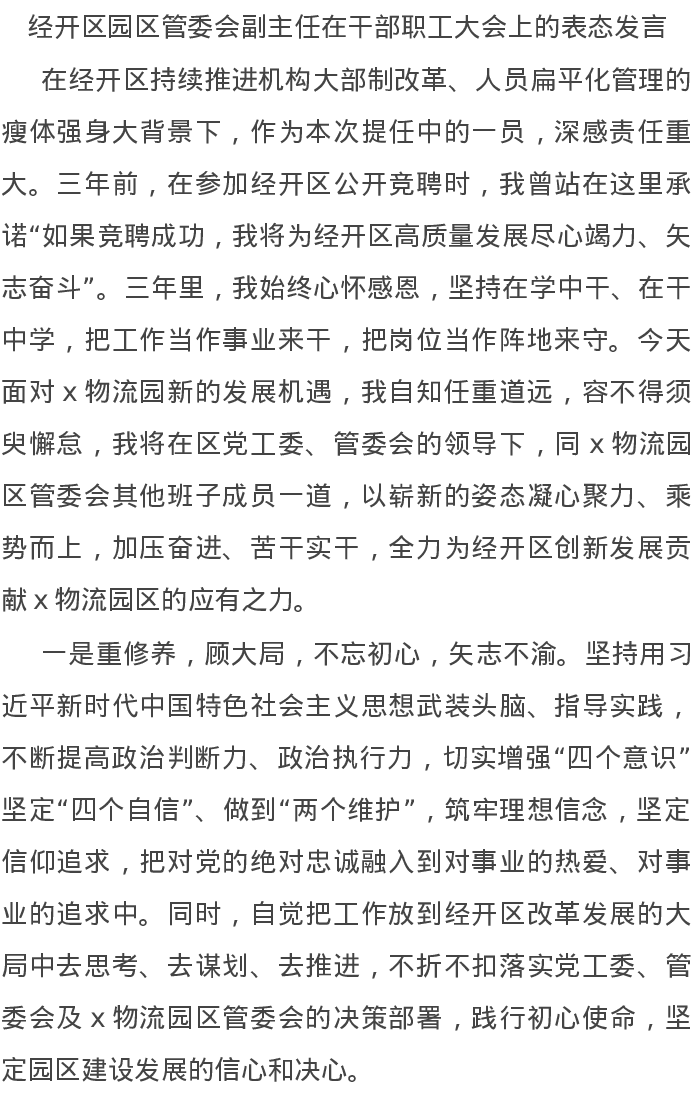 20220210经开区园区管委会副主任在干部职工大会上的表态发言