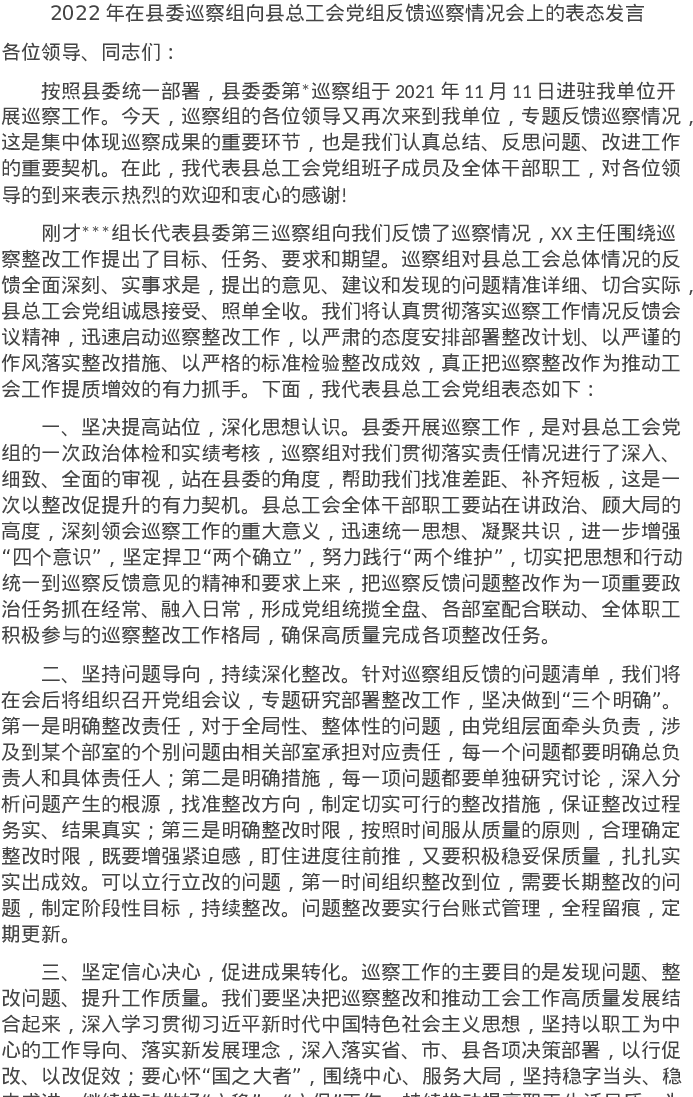 202202282022年在县委巡察组向县总工会党组反馈巡察情况会上的表态发言