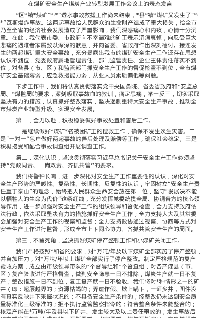 20220305在煤矿安全生产煤炭产业转型发展工作会议上的表态发言