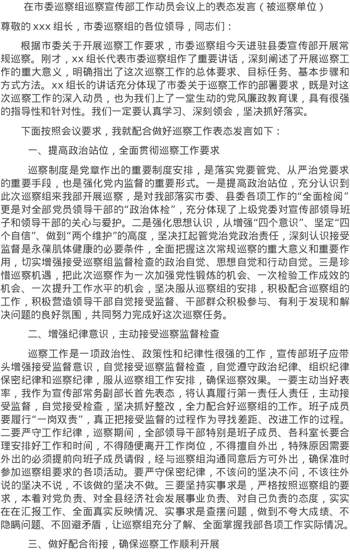 20220315在市委巡察组巡察宣传部工作动员会议上的表态发言(被巡察单位)
