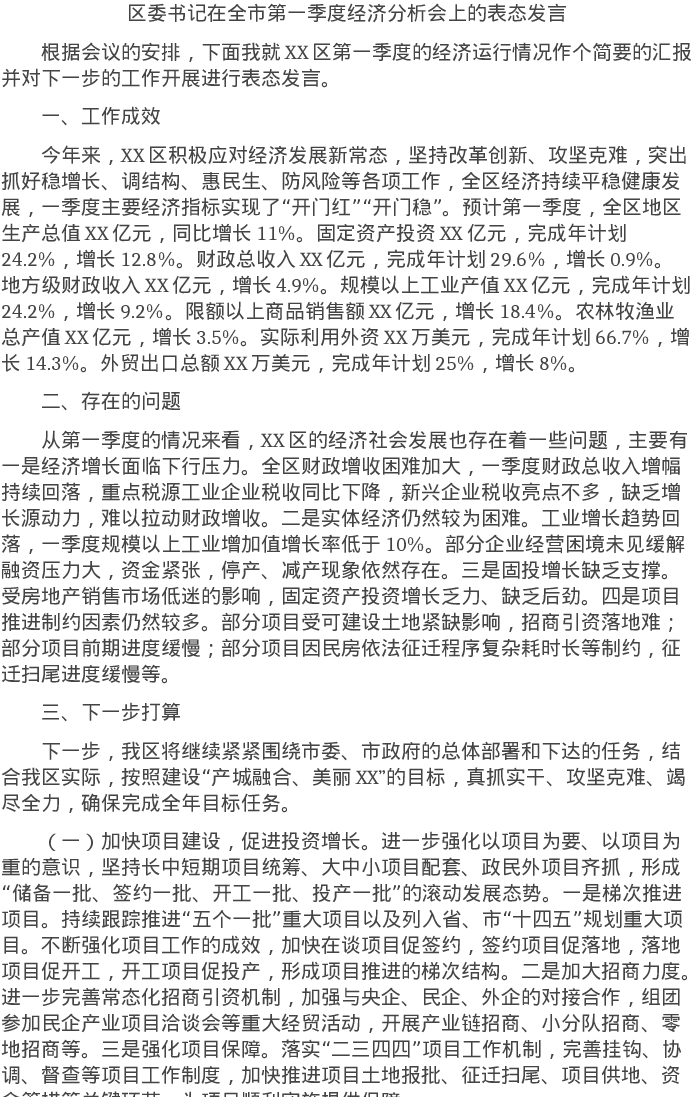 20220401区委书记在全市第一季度经济分析会上的表态发言