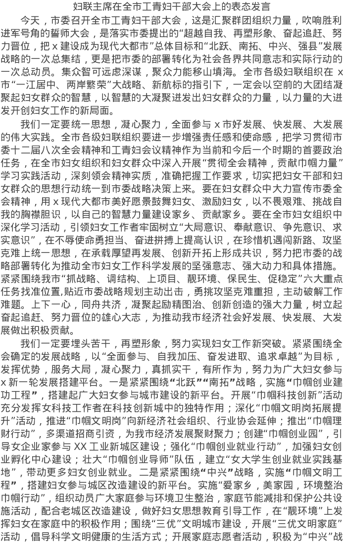 20220404妇联主席在全市工青妇干部大会上的表态发言