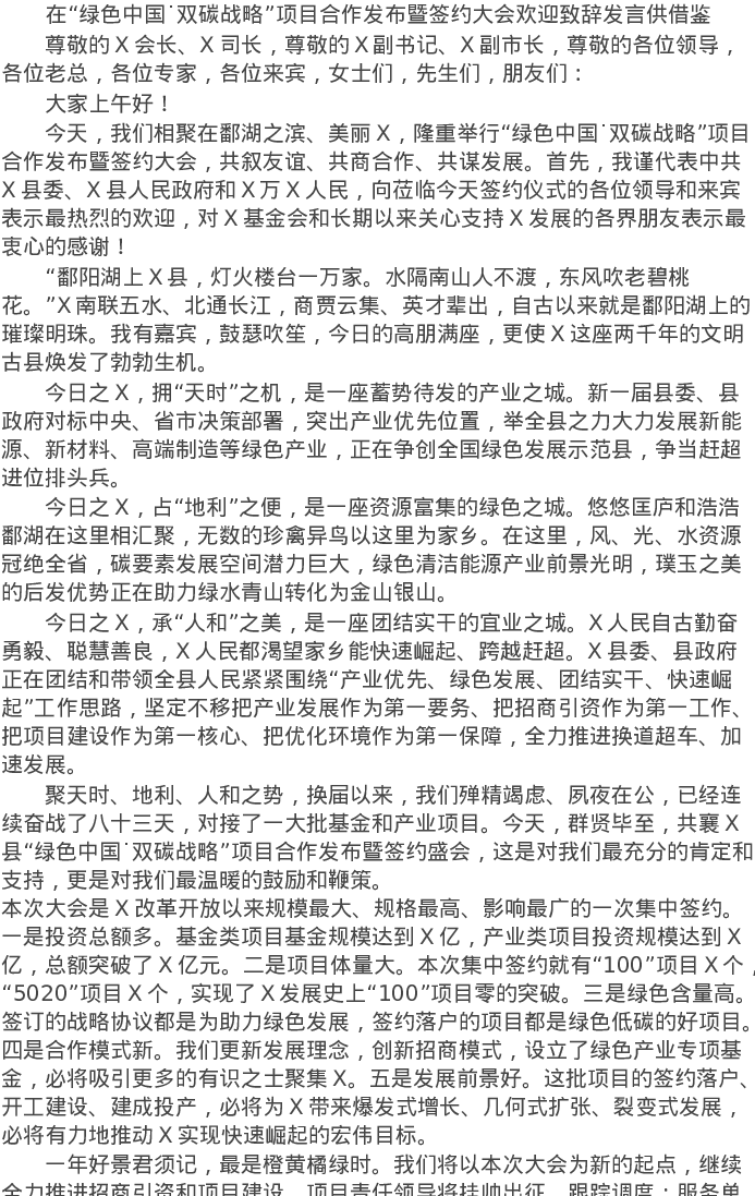 20220420在“绿色中国˙双碳战略”项目合作发布暨签约大会欢迎致辞发言供借鉴