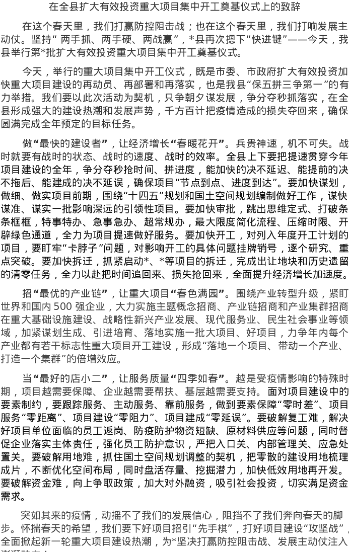 20220421在全县扩大有效投资重大项目集中开工奠基仪式上的致辞
